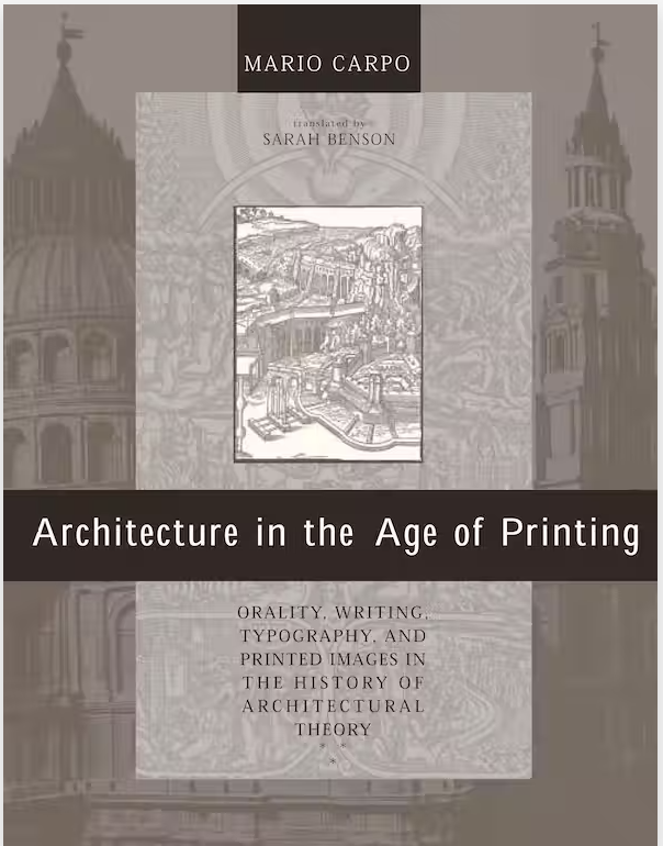 Publication History: Society of Architectural Historians Spiro Kostof Prize (2003). International Committee of Architectural Critics (CICA), Bruno Zevi Book Award 2003, shortlisted. First published in Italian as L’architettura dell’età della stampa. Oralità, scrittura, libro stampato e riproduzione meccanica dell’immagine nella storia delle teorie architettoniche. Milan: Jaca Book, 1998. Spanish translation, with a new preface: La arquitectura en la era de la imprenta. Madrid: Ediciones Cátedra, 2003. French translation, with a new preface: L’architecture à l’âge de l’imprimerie. Paris: Editions de la Villette, 2009.
